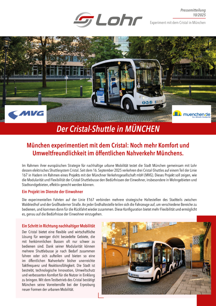 Im Rahmen seiner europäischen Strategie für nachhaltige urbane Mobilität testet die Stadt München gemeinsam mit Lohr das elektrische Shuttlesystem Cristal. Seit dem 16. September 2025 verkehren drei Cristal-Shuttles auf einem Abschnitt der Linie 167 in Hadern, im Rahmen eines Projekts mit der Münchner Verkehrsgesellschaft mbH (MVG). Das Projekt soll zeigen, wie die Modularität und Flexibilität der Cristal-Shuttlebusse den Bedürfnissen der Anwohner, insbesondere in Wohngebieten und Stadtrandgebieten, effektiv gerecht werden können.