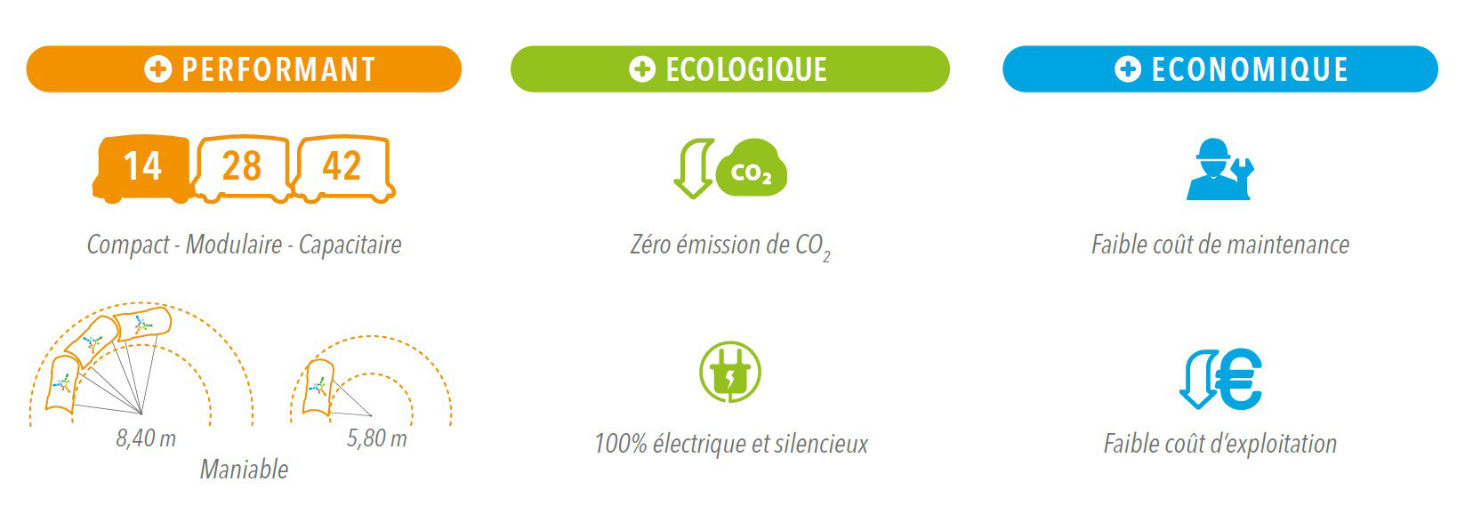 • Système d’attelage mécanique automatisé permettant une trajectoire monotrace et un faible rayon de giration,